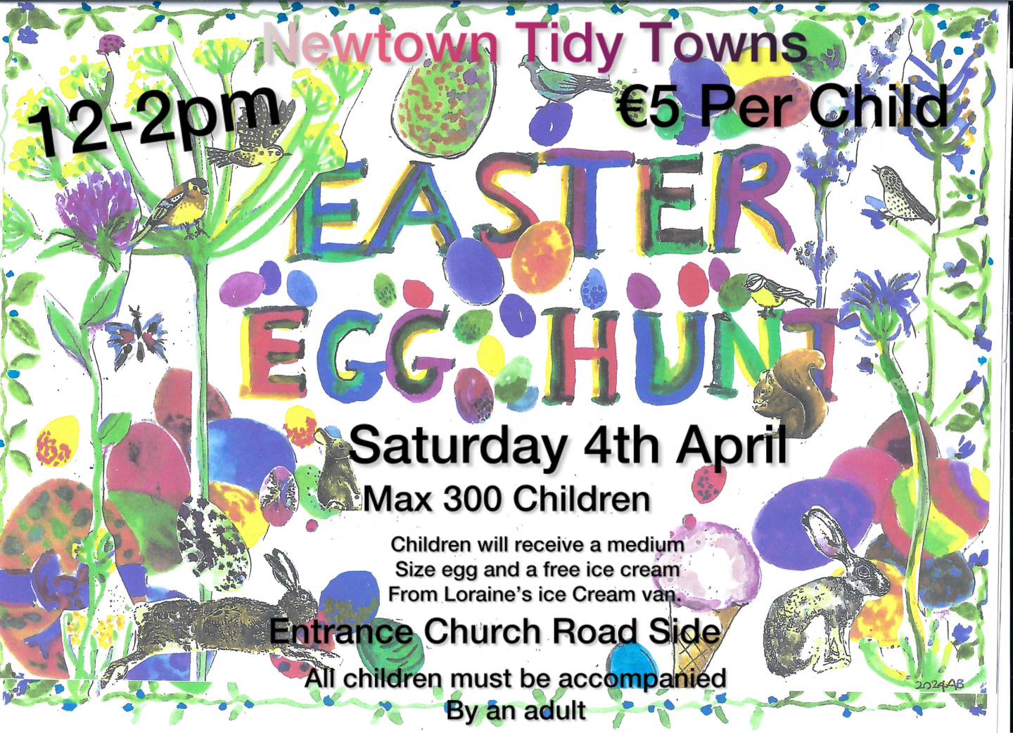 We are having our Annual Tidy Towns Easter Egg Hunt this year on Saturday 4th April 12pm until 2pm. It’s €5 per child. All children must be accompanied by an adult and will receive a medium size Easter egg and an ice cream from Lorraine’s ice cream van. Church road entrance and max 300 children. Spread the word and let everyone know.