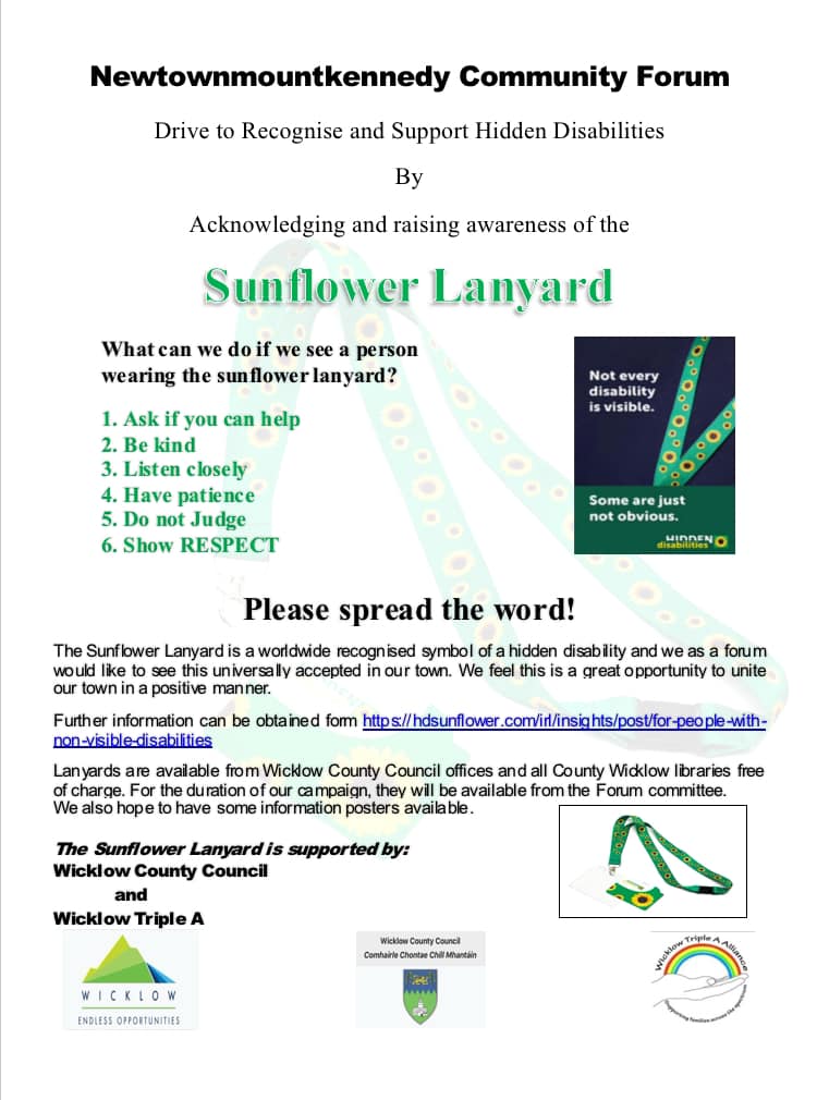 In December 2024, the Newtownmountkennedy Community Forum launched their “Sunflower Lanyard Awareness Campaign”, an information campaign to help unite the community and spread awareness of hidden disabilities.